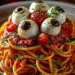 Serve up a spooktacular meal this Halloween with ‘Bloody Spaghetti’ adorned with eerie Mozzarella Eyeballs. This fun and festive dish combines al dente pasta with a rich tomato sauce, perfect for a themed gathering.