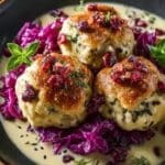 These hearty pretzel dumplings, known as Brezenknödel, are a delightful Bavarian-inspired dish. Paired with sweet and tangy red cabbage and a rich bacon-cream sauce, it’s a perfect meal for cozy evenings.