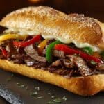Ein herzhaftes und aromatisches Cheesesteak-Sandwich, das mit dünn geschnittenem Fleisch, karamellisierten Zwiebeln und geschmolzenem Käse gefüllt ist. Dieses Rezept ist perfekt für ein schnelles und befriedigendes Abendessen.
