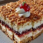 Dieses Rezept verwandelt den traditionellen Frankfurter Kranz in praktische und unwiderstehliche Schnitten. Jeder Bissen vereint den luftigen Biskuit mit einer zarten Creme und dem charakteristischen Krokant.