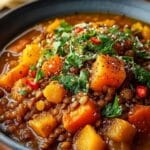 Für eine Low-Carb-Variante: Tauschen Sie die Linsen gegen Blumenkohlröschen oder Brokkoliröschen aus und erhöhen Sie die Menge an Kürbis. Achten Sie auf eine kohlenhydratarme Gemüsebrühe. Dies verändert die Textur leicht, behält aber die herzhaften Aromen bei.