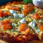 Diese einzigartige Kartoffelpizza kombiniert einen knusprigen Kartoffelboden mit cremigem Frischkäse und zartem geräuchertem Lachs. Ein einfaches, aber raffiniertes Gericht, das warm oder bei Raumtemperatur begeistert.