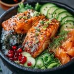 Die Wahl frischer und hochwertiger Zutaten ist das Geheimnis hinter jeder herausragenden Mahlzeit, und diese Lachs-Bowls bilden da keine Ausnahme. Ein perfekt gegartes Lachsfilet, das auf der Zunge zergeht, ist das Herzstück, ergänzt durch die nussige Note von Quinoa und die erfrischende Vielfalt des Gemüses.