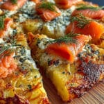Eine innovative Kartoffelpizza mit rauchigem Lachs und cremigem Frischkäse, perfekt für ein schnelles und dennoch raffiniertes Abendessen.