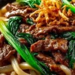 Stellen Sie sich vor: Ein Teller, der Wärme, Tiefe und eine wunderbare Kombination von Texturen vereint, alles in nur einer Schüssel. Diese Udon-Nudeln mit Rindfleisch, Pak Choi und knusprigen Röstzwiebeln sind mehr als nur eine Mahlzeit; sie sind eine kulinarische Umarmung, die perfekt für einen gemütlichen Abend oder ein schnelles, aber sättigendes Mittagessen ist.