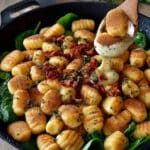 Gnocchi sind gar, wenn sie an die Oberfläche des kochenden Salzwassers schwimmen. Dies dauert in der Regel nur 2-3 Minuten. Sobald sie oben sind, lasse sie noch etwa 10-20 Sekunden ziehen, bevor du sie mit einem Schaumlöffel herausnimmst und abtropfen lässt.